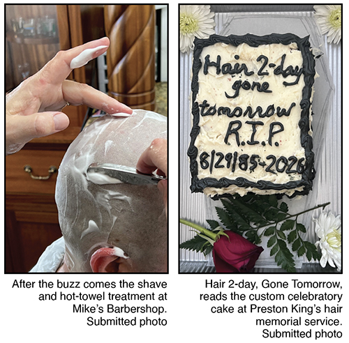 Preston Sky King, seated, is about to say ‘good-bye’ to his hair, as Jon Elliott of Mike’s Barbershop prepares to send it off to the great beyond, and Preston’s wife, Sarah, reads a eulogy. Submitted photo