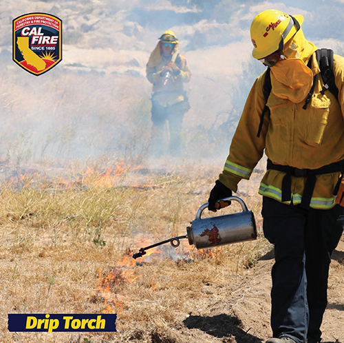 A Cal Fire firefighter uses a drip torch to ignite a controlled burn, one of the ways Cal Fire manages fuel loads to lessen the impact of wildfires.